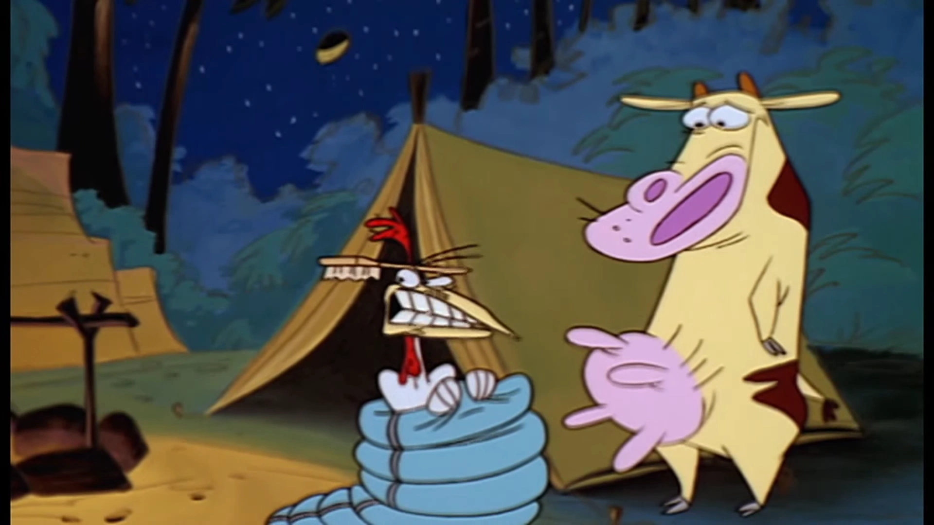 March 14, 1998 The 11:00pm airing of the Cow and Chicken episode The Karate Chick / Yard Sale was faced with a significant amount of technical difficulties. Prior to the start of the show, the Starburst Cartoon Cartoons intro is used despite its corresponding era having recently been retired at that point. Right after it ends, a Powerhouse bumper introducing the show plays, only for it to abruptly fade out midway through. Lastly, the screenbug is not present throughout the entire duration of the episode.