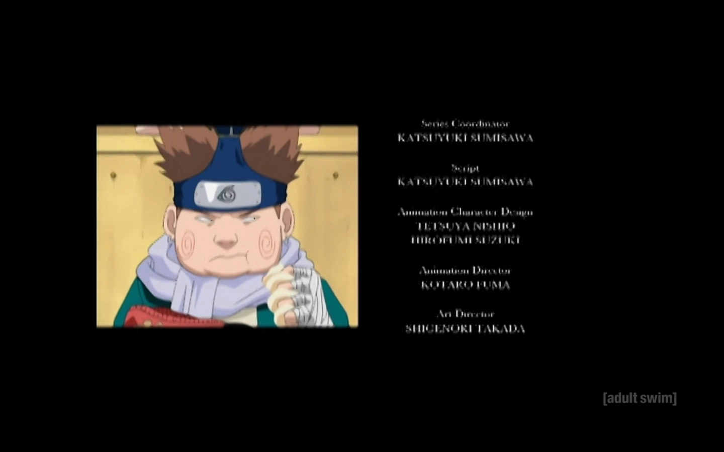 February 9, 2025 The airing of the Naruto episode You Failed! Kakashi’s Final Decision used the old edited version from Cartoon Network, complete with “Rise, Power!” as the opening and ending (both of which were visually compressed) and the pillarbox bars were pitch black instead of using the “space” versions that 4:3 Toonami programming typically uses.
