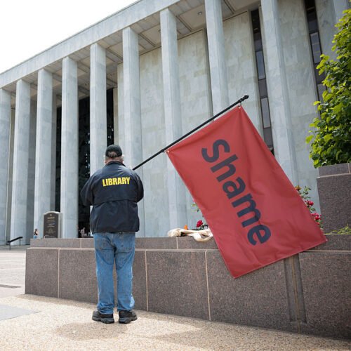A man holds a flag that reads “Shame” outside the Library of Congress on May 12, 2025 in Washington, DC. On May 8th, President Donald Trump fired Carla Hayden, the head of the Library of Congress, and Shira Perlmutter, the head of the US Copyright Office, just days after.