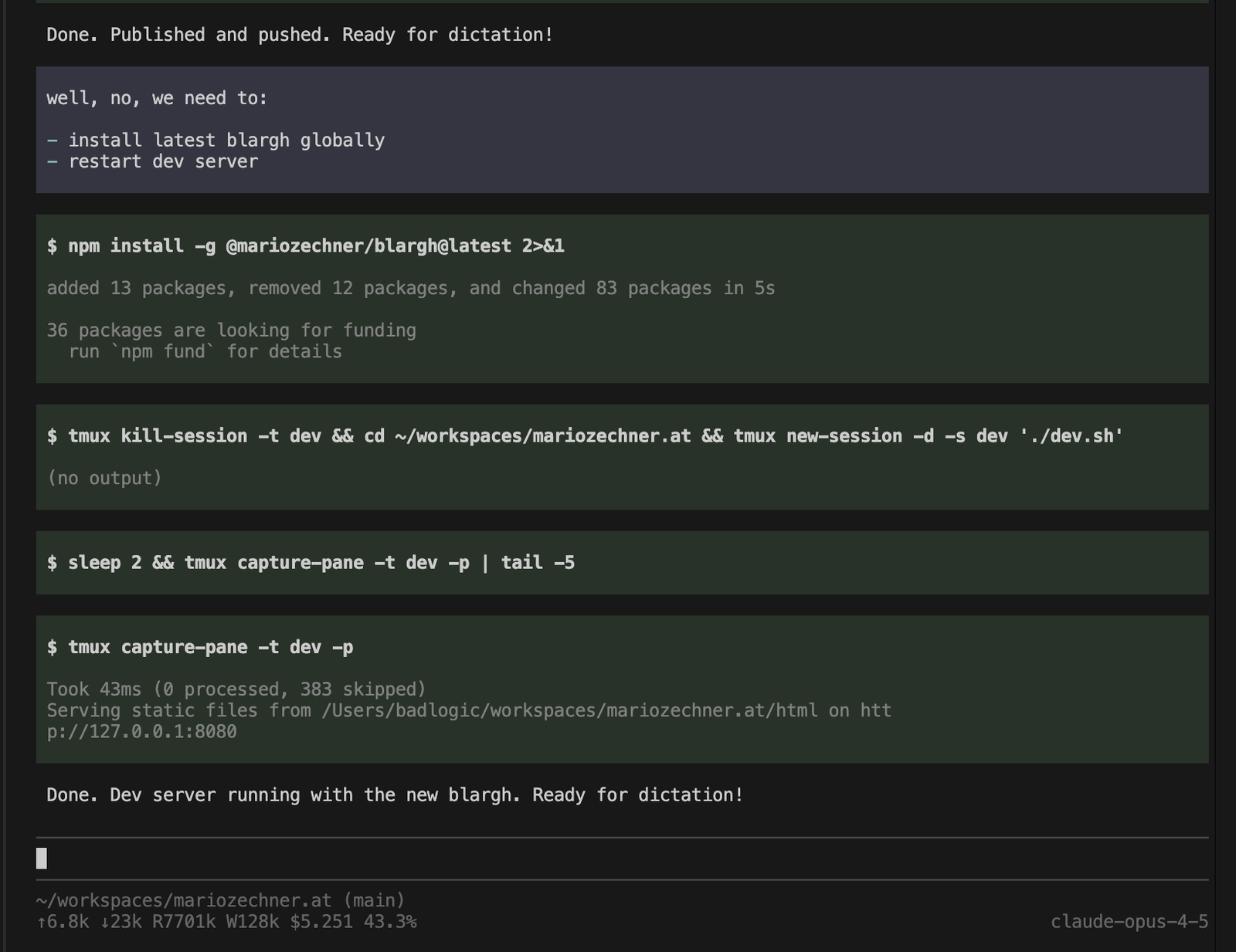 Of course, this is a bit of a simulated use case. In reality, I would just spawn a new pi session and ask it to review the pull request, possibly pull it into a branch locally. After I see its initial review, I give my own review and then we work on it together until it’s good. That’s the workflow I use to not merge garbage code.